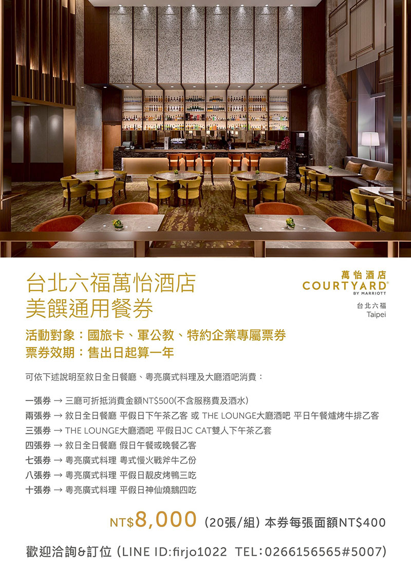2026 台北六福萬怡酒店 美饌通用餐券套券組(20張/組) 售價$8000 (效期售出日起算一年)